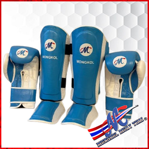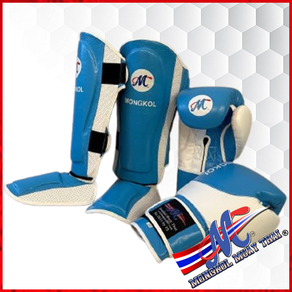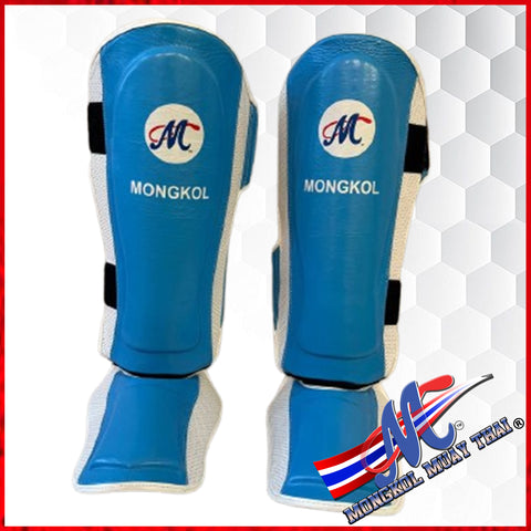Mongkol Muay Thai Leather Shin Guards – Light Blue & White
