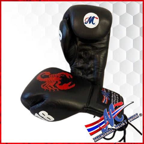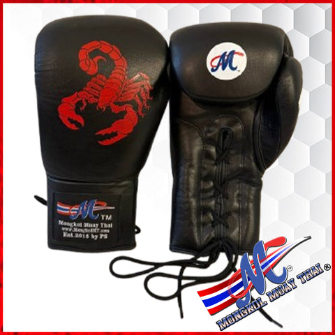 Mongkol Epic Collection Boxing Gloves – Red Scorpion (Black Leather, Lace-Up, 16oz)