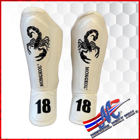 White Scorpion Mongkol Shin Guards — clean look, deadly intent.